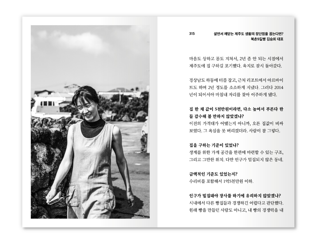 제주의 오픈 3년 이하 이주민의 가게들과 인터뷰했다. 카페, 민박, 서점, 빵집 등 업종은 다양하다. 소위 도시의 반복되는 일상에서 탈출한 사람들의 공간이며, 십중팔구 부러움의 대상일 거다. 놀고먹는 것으로 보이기도 한다. 그들의 실제 삶에 대해 취재했다. 편집되어 소비되는 환상의 이면에 어떤 현실적인 고민과 노력이 있는지 묻는다. 이주를 통해 바랐던 삶의 방식을 일궈내고 있는가?