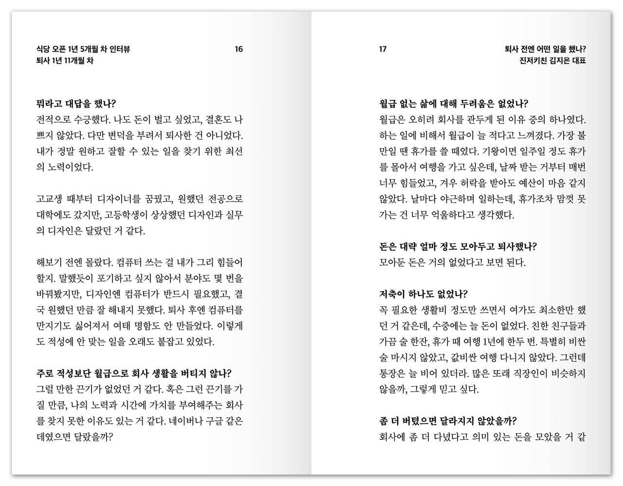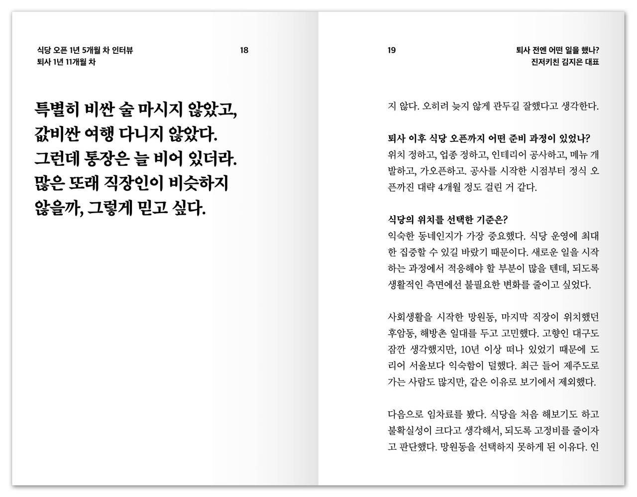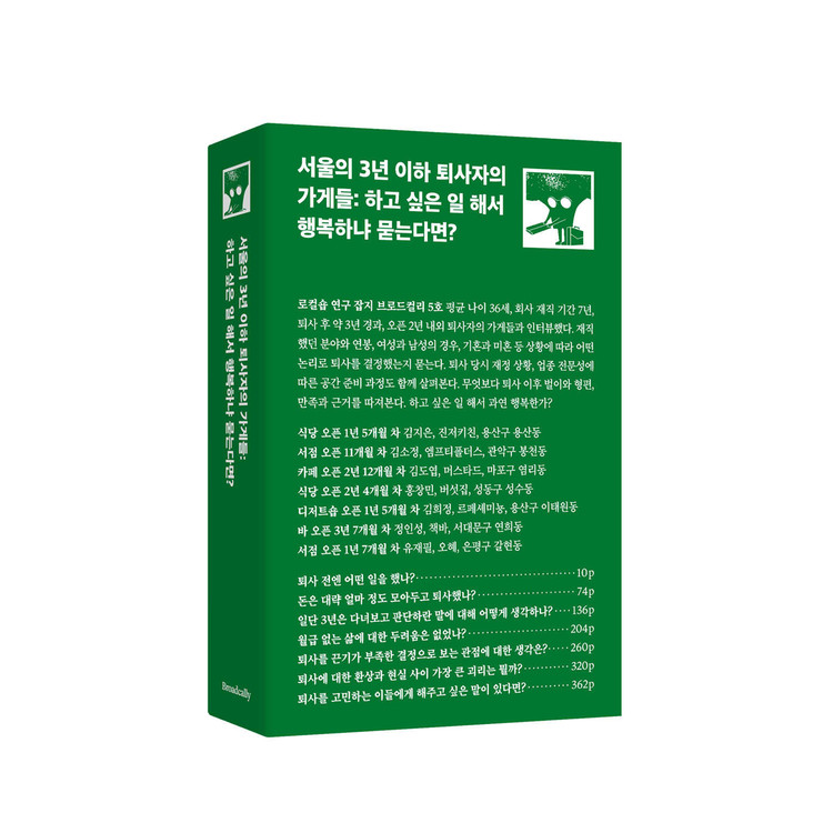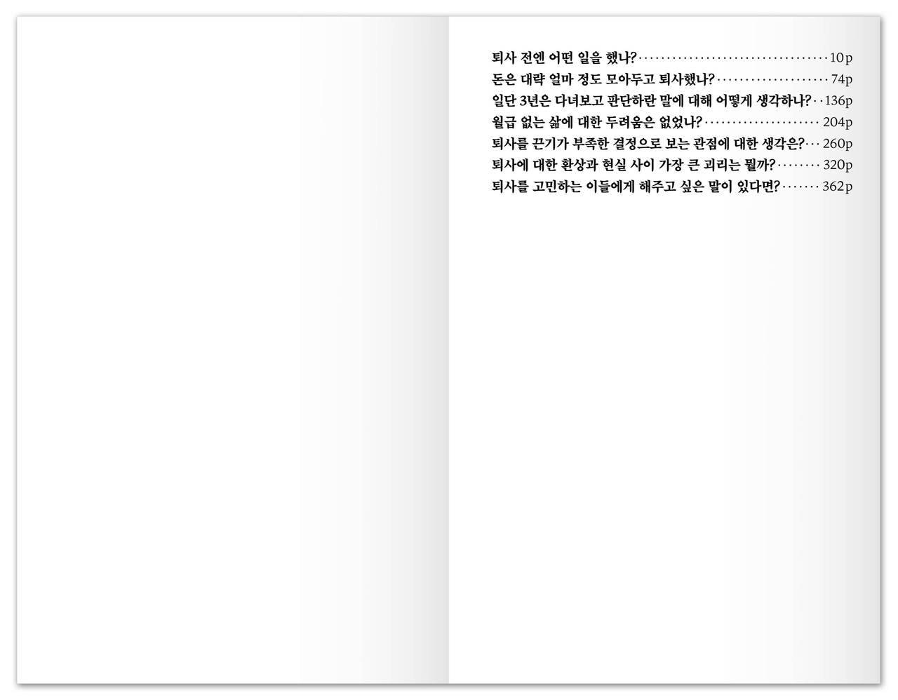 평균 나이 36세, 회사 재직 기간 7년, 퇴사 후 약 3년 경과, 오픈 2년 내외 퇴사자의 가게들과 인터뷰했다. 재직했던 분야와 연봉, 여성과 남성의 경우, 기혼과 미혼 등 상황에 따라 어떤 논리로 퇴사를 결정했는지 묻는다. 퇴사 당시 재정 상황, 업종 전문성에 따른 공간 준비 과정도 함께 살펴본다. 무엇보다 퇴사 이후 벌이와 형편, 만족과 근거를 따져본다. 하고 싶은 일 해서 과연 행복한가?