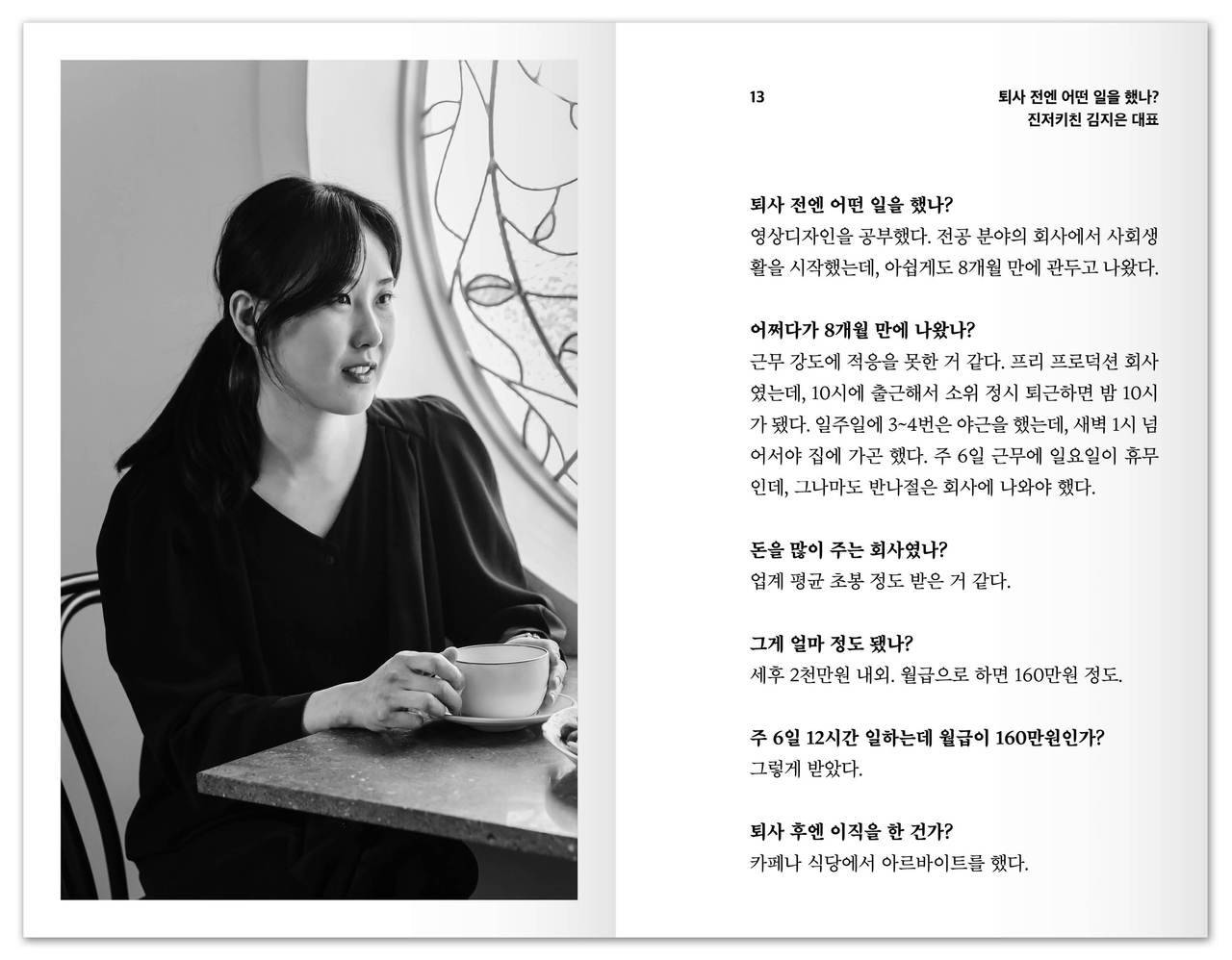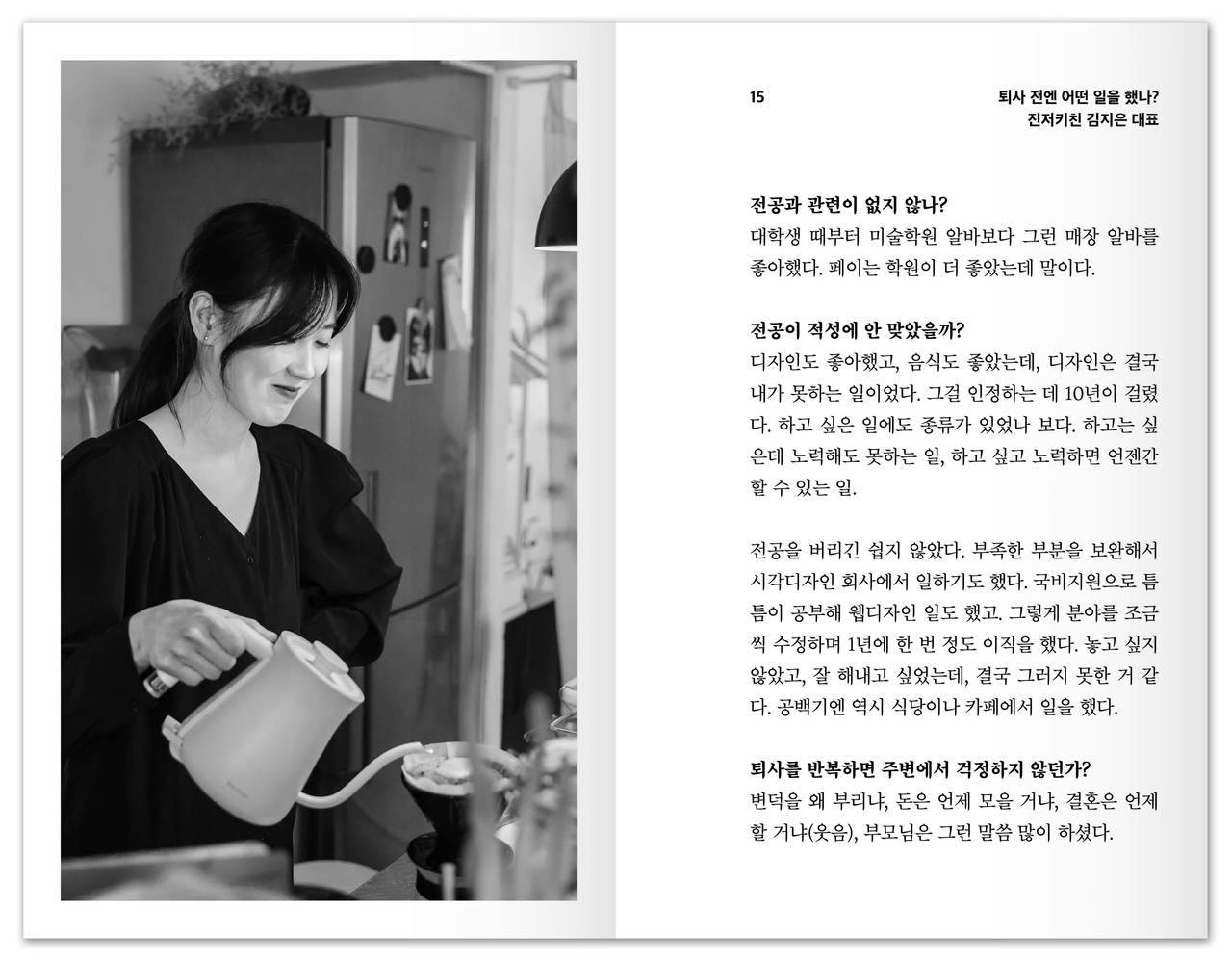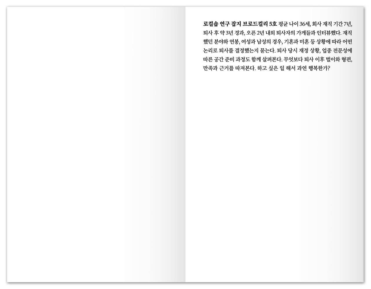 평균 나이 36세, 회사 재직 기간 7년, 퇴사 후 약 3년 경과, 오픈 2년 내외 퇴사자의 가게들과 인터뷰했다. 재직했던 분야와 연봉, 여성과 남성의 경우, 기혼과 미혼 등 상황에 따라 어떤 논리로 퇴사를 결정했는지 묻는다. 퇴사 당시 재정 상황, 업종 전문성에 따른 공간 준비 과정도 함께 살펴본다. 무엇보다 퇴사 이후 벌이와 형편, 만족과 근거를 따져본다. 하고 싶은 일 해서 과연 행복한가?