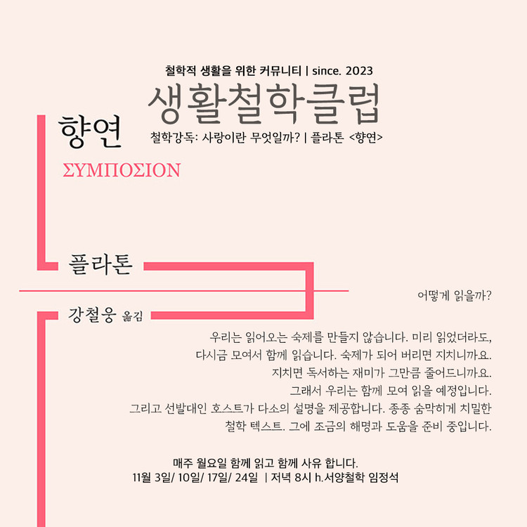 2025년 플라톤의 《향연》을 함께 강독하며 사유를 넓혀보는 자리를 마련합니다.
