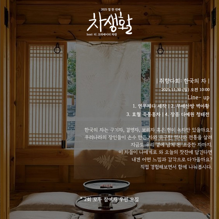 몸과 마음을 챙기는 차 생활을 위한 두 번의 자리를 마련합니다.