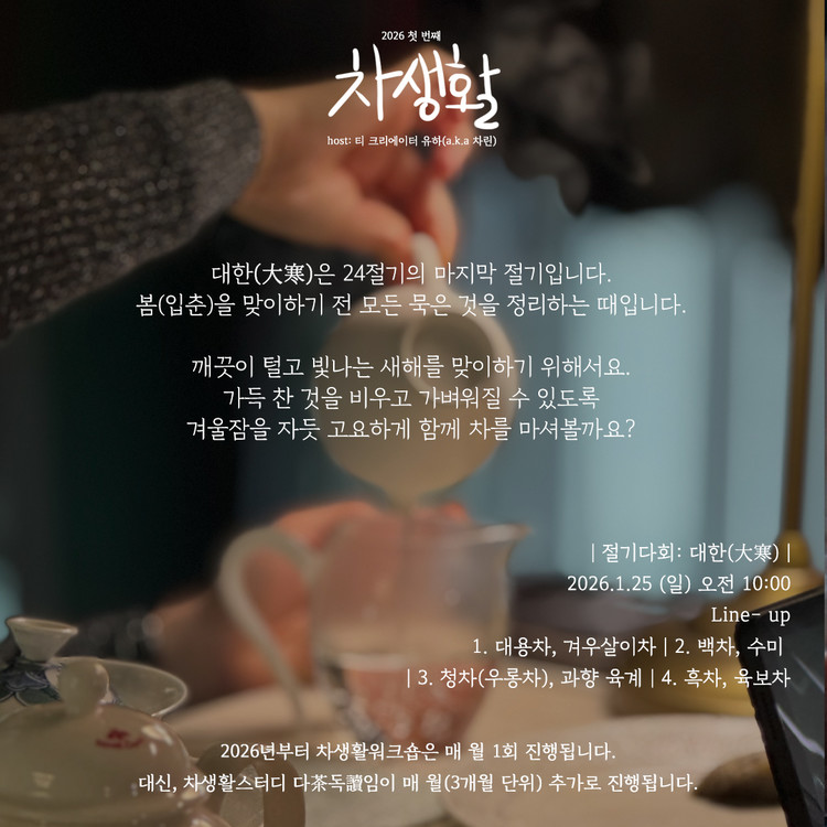 대한은 24절기의 마지막 절기입니다. 봄(입춘)을 맞이하기 전 모든 묵은 것을 정리하는 때입니다. 깨끗이 털고 빛나는 새해를 맞이하기 위해서요. 가득 찬 것을 비우고 가벼워질 수 있도록 겨울잠을 자듯 고요하게 함께 차를 마셔볼까요? 총 4종의 겨울철에 마시면 좋을 차(대용차, 백차, 청차, 흑차)를 경험하며 취향을 발견하고, 우리의 이웃들과 함께 다양한 차 문화를 이해하고 일상 속에 차생활 커뮤니티가 자리잡기를 바랍니다.