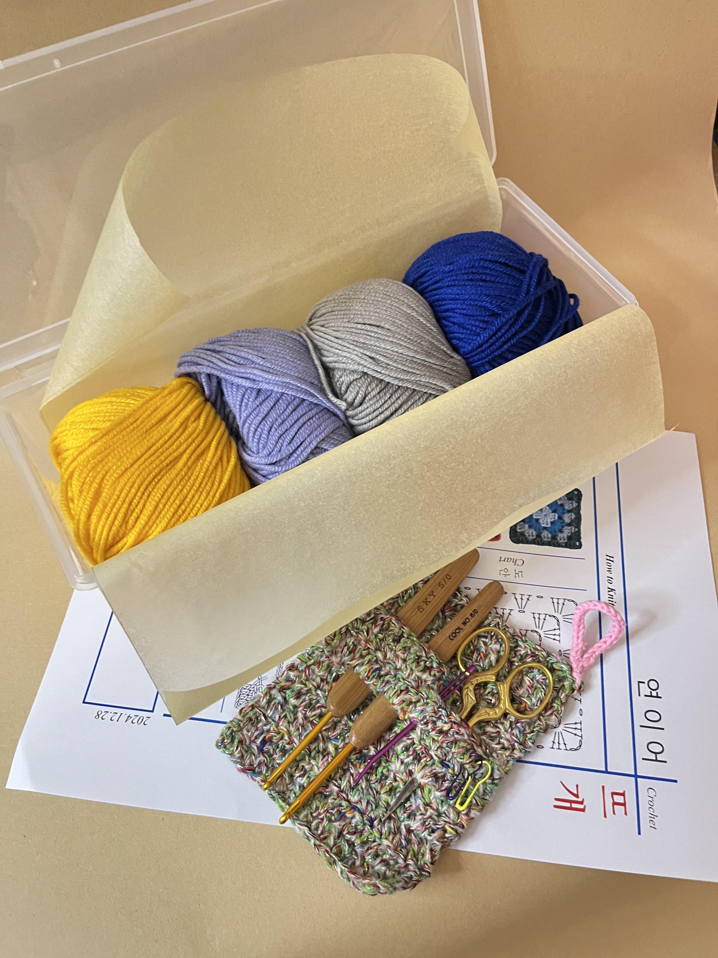 도안, 실 4타래, 코바늘 2개, 미니가위 1개, 돗바늘 2개 구성