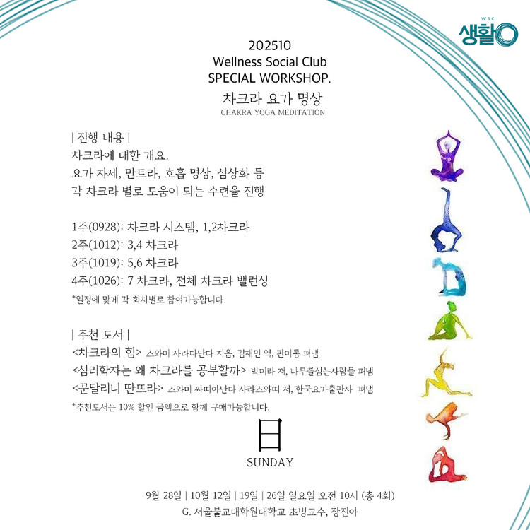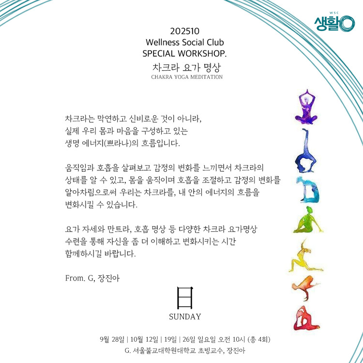 서울불교대학원대학교 초빙교수이신 장진아 선생님과의 차크라 요가 명상 워크숍을 준비합니다.