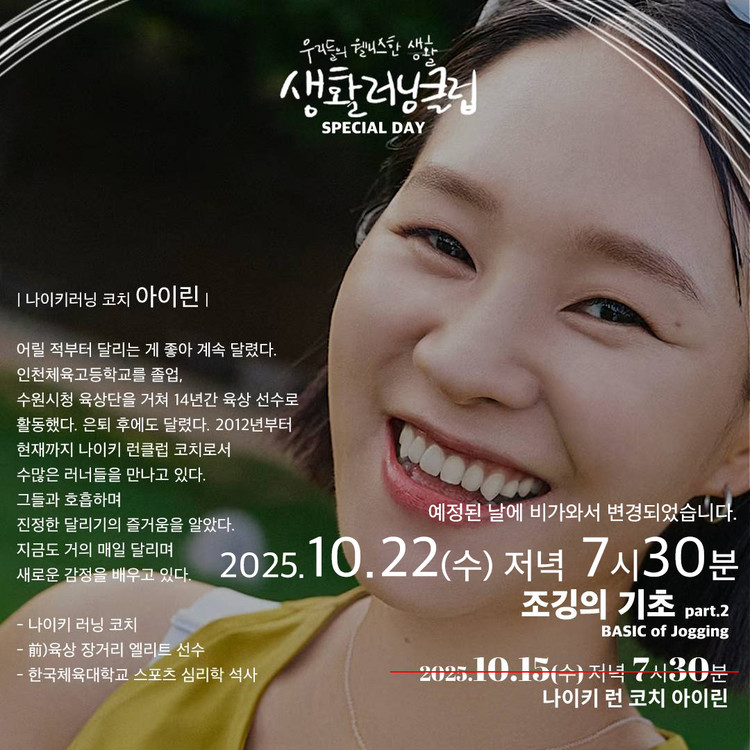 *우천 연기로 10월 22일 수요일 저녁 7시 30분으로 변경되었습니다.