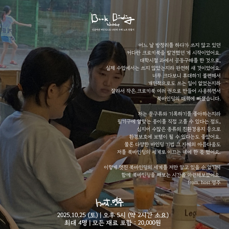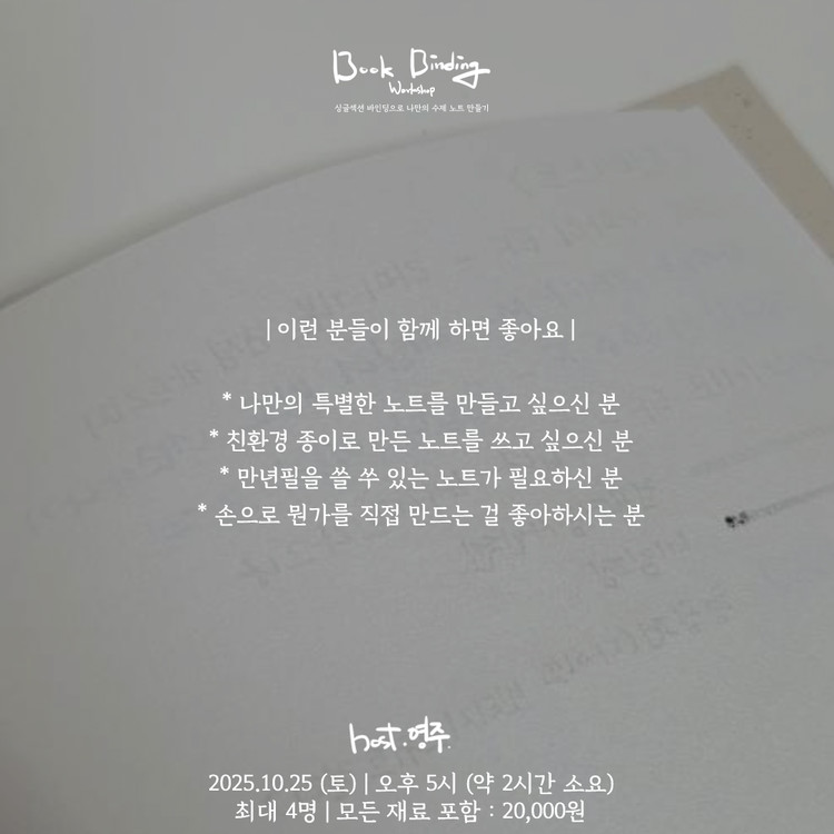 이렇게 멋진 북바인딩의 세계를 저만 알고 있을 순 없기에 함께 북바인딩을 해보는 시간을 마련해보았어요.