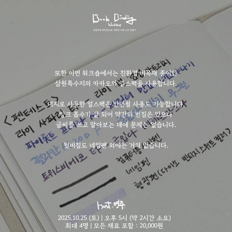 또한 이번 워크숍에서는 친환경 비목재 종이인 삼원 특수지의 카카오와 얼스팩을 사용합니다 .