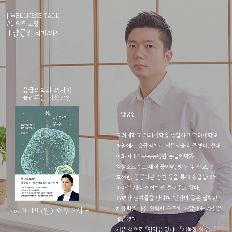 신간 도서 뿐 아니라 남궁인 의사 혹은 작가에게 궁금한 무엇이든 묻고 듣는 자리로 마련합니다.