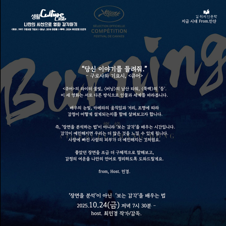 〈큐어〉, 〈버닝〉, 〈룩백〉의 주요 장면을 함께 감상합니다.